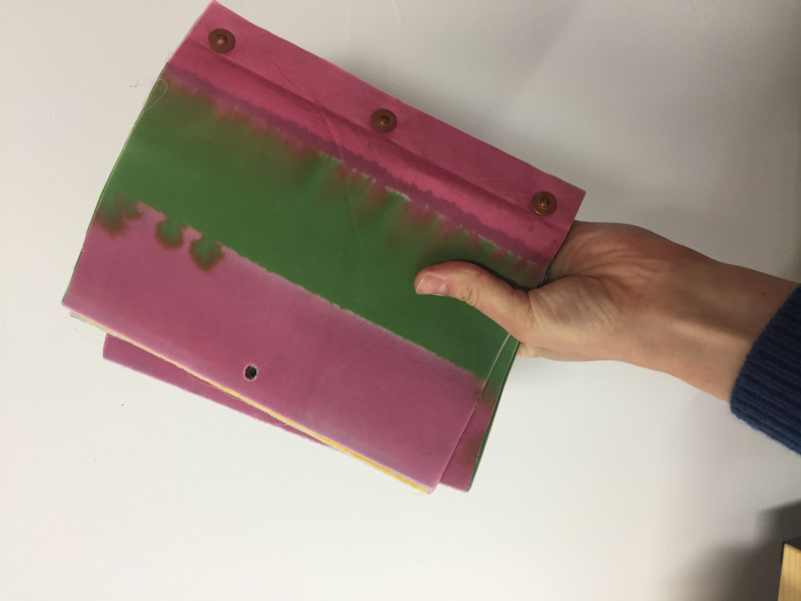 Dye, wax on cotton with unique perforations & stamped tags, coptic handbound